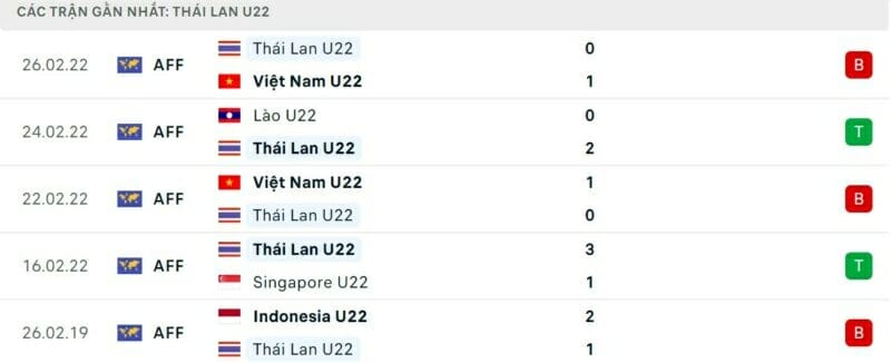 Phong độ gần đây U22 Thái Lan vs U22 Singapore: