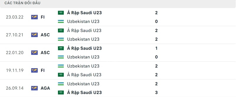 Thành tích đối đầu U23 Uzbekistan vs U23 Ả Rập Xê Út: