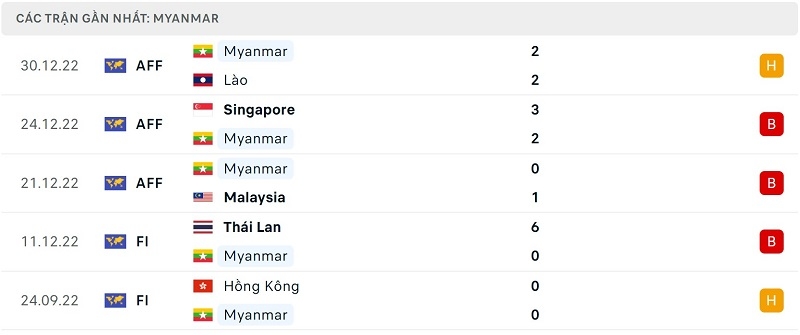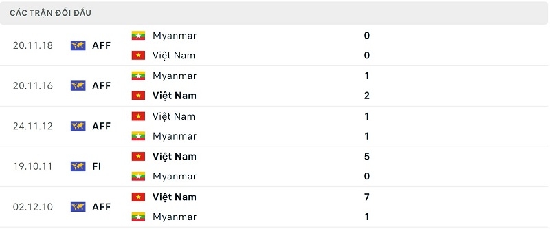 Thành tích đối đầu Việt Nam vs Myanmar: