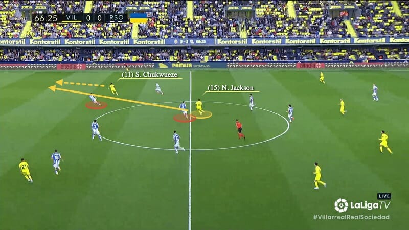 Trong trận gặp Real Sociedad, tiền đạo 22 tuổi có pha nhận bóng từ thủ môn. Anh chủ động khống chế để bóng nảy sang ngang, làm tiền đề cho cú mở bóng lên cho Samuel Chukwueze bên cánh phải.