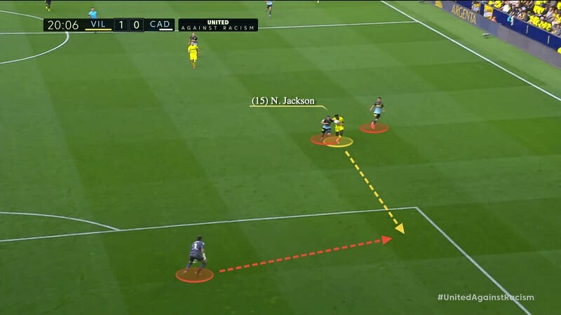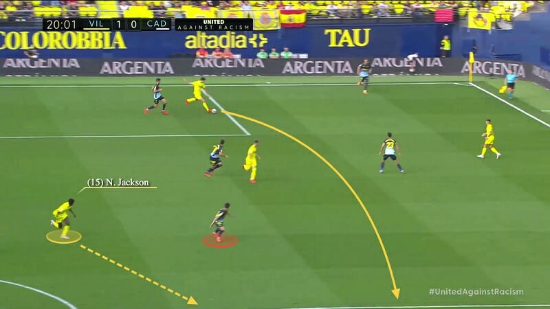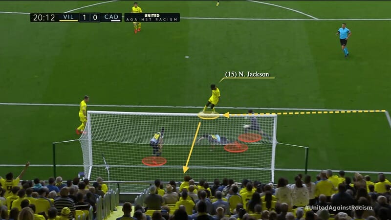 Ở ví dụ dưới đây, Jackson lao xuống để nhận đường chuyền dài của Dani Parejo. Chân sút đến từ châu Phi thậm chí còn dư ra vài giây căn chỉnh thật kỹ trước khi đặt lòng nhẹ nhàng thành bàn.