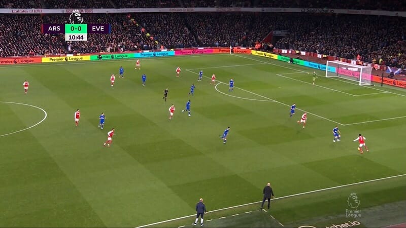 Để đưa Saka và Martinelli vào những pha 1v1, Arteta chỉ đạo hai hậu vệ biên đứng dưới thấp và dạt một chút vào khu vực hành lang trong. Hãy xem vị trí của Ben White ở hình sau đây, khi Arsenal tiếp đón Everton. Hậu vệ người Anh không ham chồng biên, thay vào đó anh chịu trách nhiệm đánh chặn nếu Saka để mất bóng.