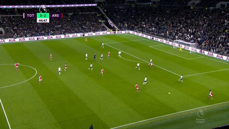 Cách White chiếm không gian nơi hành lang trong cũng đảm bảo rằng Saka được nhận bóng ở tư thế hướng mặt vào vùng cấm địa, từ đó dễ tấn công đối phương.