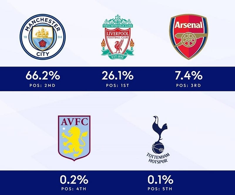 Theo đó, Man City là đội có khả năng giành chức vô địch cao nhất với tỷ lệ 66,2%. Dẫu The Citizens hiện chỉ đứng nhì giải đấu với tổng cộng 49 điểm, kém đội dẫn đầu là Liverpool 2 điểm nhưng họ vẫn còn 1 trận chưa đấu trong tay. Nếu giành chiến thắng ở trận đá bù ấy, thầy trò HLV Pep Guardiola sẽ giành lấy ngôi đầu từ chính The Kop.