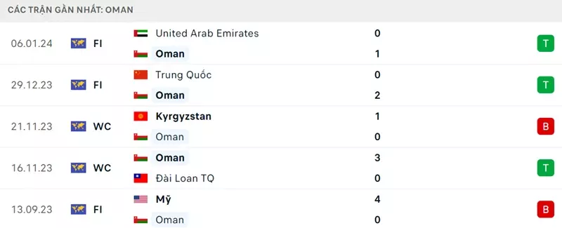 Với Oman, phong độ của họ cũng rất tốt. Họ thắng 6/8 lần ra sân gần đây. Trong đó, Oman đã vượt qua UAE (một đại diện Tây Á) với tỷ số 1-0 ở màn tổng duyệt cuối cùng cho Asian Cup 2023.