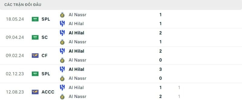 Thành tích đối đầu Al Hilal vs Al Nassr