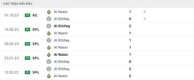 Thành tích đối đầu Al Nassr vs Al Ettifaq: