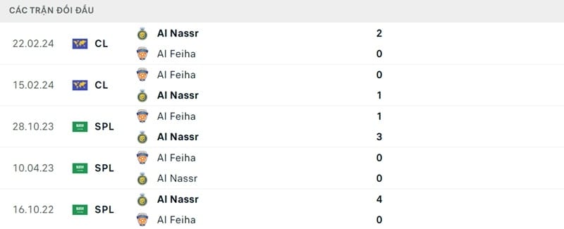 Thành tích đối đầu Al Nassr vs Al Feiha
