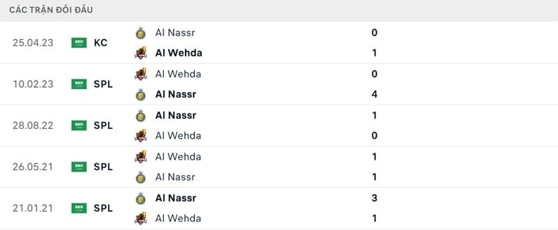 Thành tích đối đầu Al Wehda vs Al Nassr:
