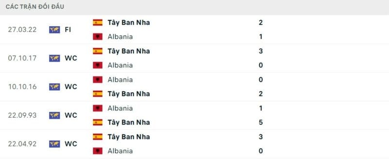 Thành tích đối đầu Albania vs Tây Ban Nha