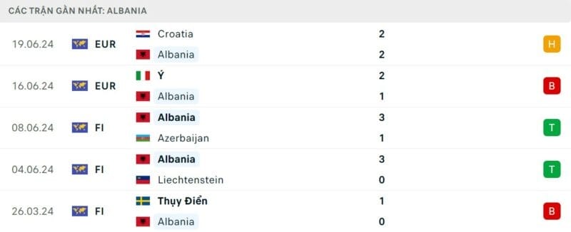 Phong độ Albania vs Tây Ban Nha