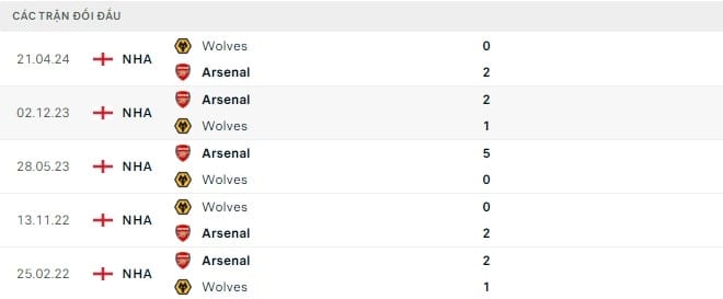 Thành tích đối đầu Arsenal vs Wolves