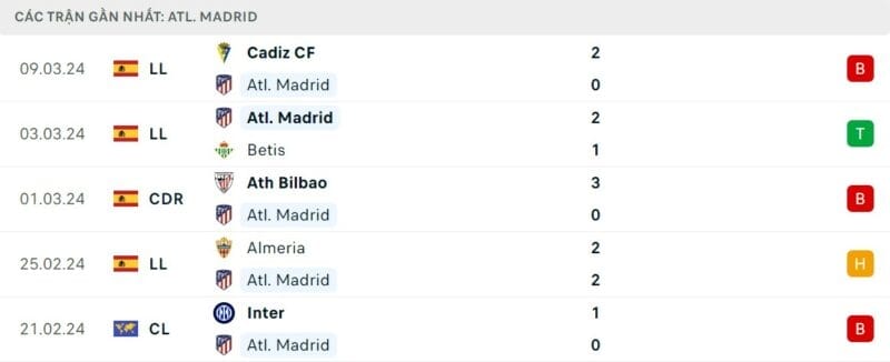 Chuỗi trận thất vọng khiến Atletico Madrid có nguy cơ rơi ra khỏi top 4 La Liga. Họ chỉ còn hơn đội xếp sau 2 điểm và đã kém Barcelona phía trên tới 6 điểm.
