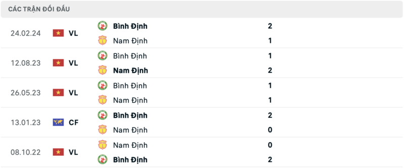 Thành tích đối đầu Bình Định vs Nam Định