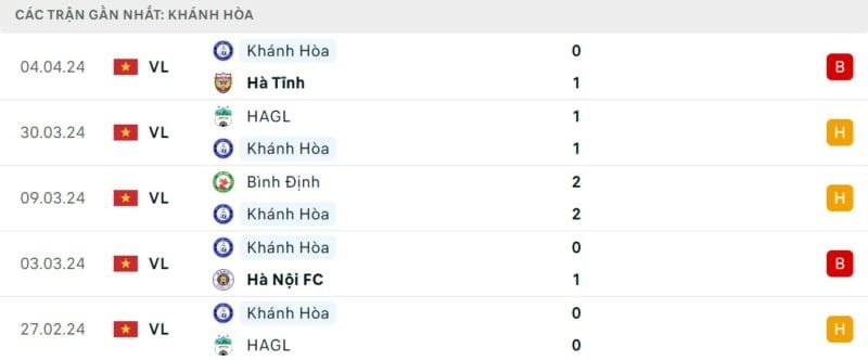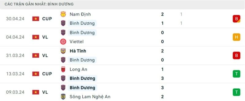 Phong độ gần đây Bình Dương vs Khánh Hòa