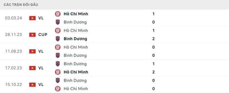 Thành tích đối đầu Bình Dương vs TP.HCM