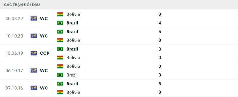 Thành tích đối đầu Brazil vs Bolivia