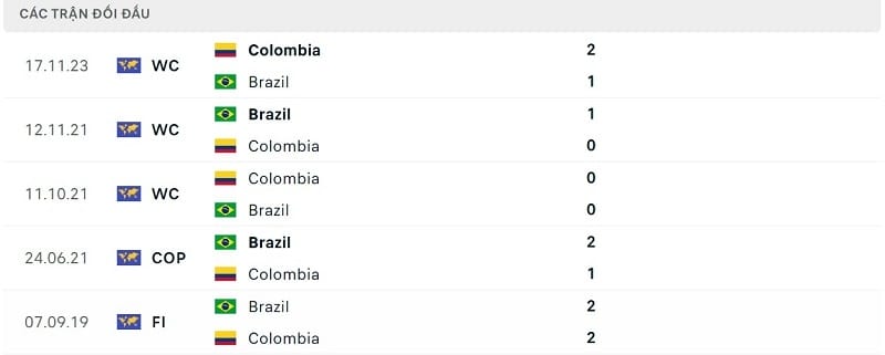 Thành tích đối đầu Brazil vs Colombia