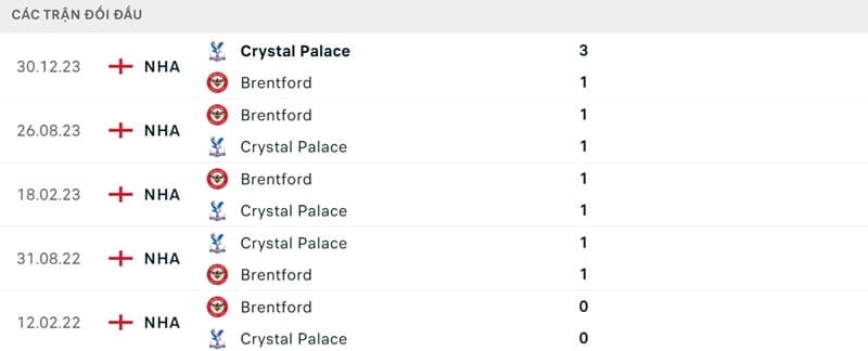 Thành tích đối đầu Brentford vs Palace