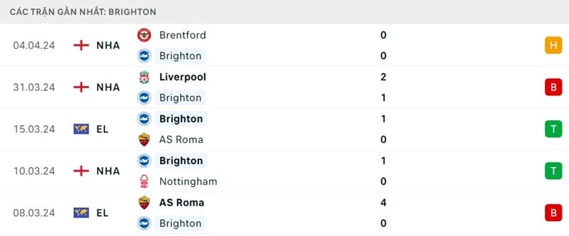 Vì vậy, Seagulls chỉ ghi bàn một lần trong năm trận sân khách gần đây nhất ở tất cả các giải đấu. Họ bỏ lỡ cơ hội trở lại top 7 khi xếp vị trí thứ 9 trước thềm tiếp đón Arsenal. Sân nhà vốn là điểm tựa vững chắc để đoàn quân của ông De Zerbi kỳ vọng về kết quả khả quan. Được biết, Seagulls đang có chuỗi 14 trận bất bại tại sân vận động Amex kể từ lúc gặp AEK Athens trong trận đấu tại Europa League vào tháng 9. Ở 2 trận sân nhà gần nhất, họ đều vượt qua Nottingham Forest và AS Roma với cùng tỷ số 1-0.