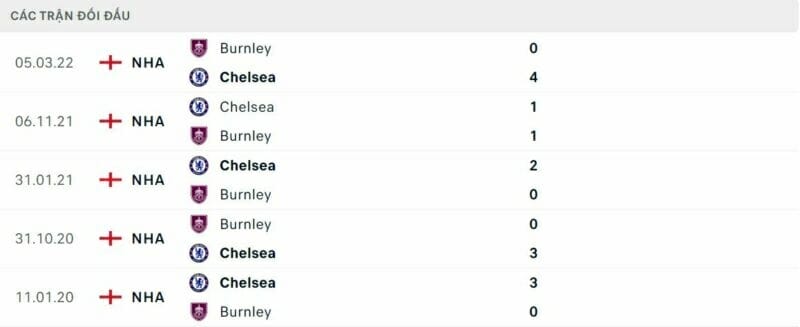 Thành tích đối đầu Burnley vs Chelsea