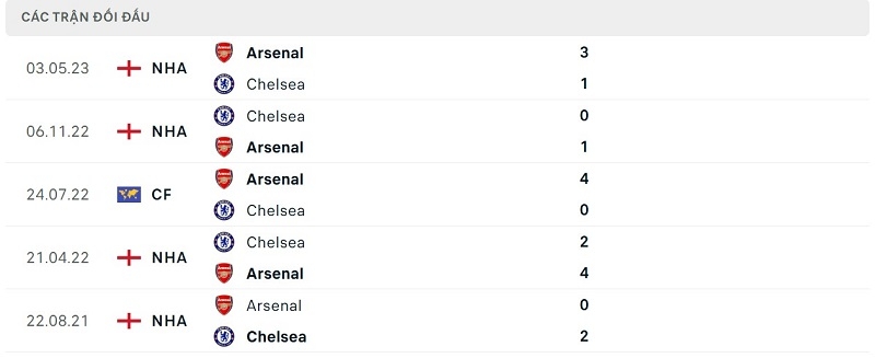 Thành tích đối đầu Chelsea vs Arsenal: