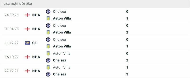Thành tích đối đầu gần đây cũng đứng về phía đội chủ sân Villa Park. Họ toàn thắng Chelsea trong 3 trận gặp nhau gần nhất, ghi được 4 bàn và không để lọt lưới lần nào. Nhưng tính rộng hơn trong 10 trận thì lại khá cân bằng với mỗi bên sở hữu 4 thắng lợi và 2 lần chia điểm.