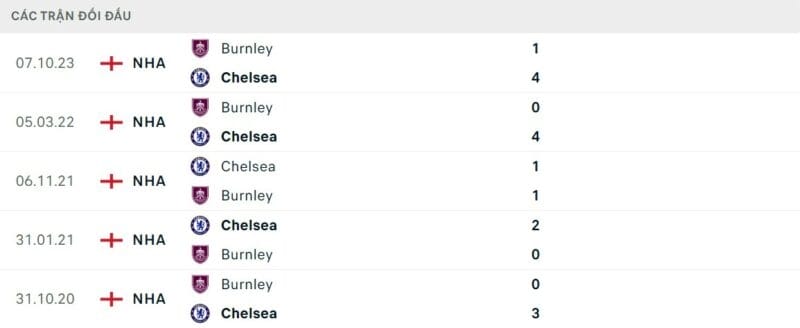 Thành tích đối đầu Chelsea vs Burnley