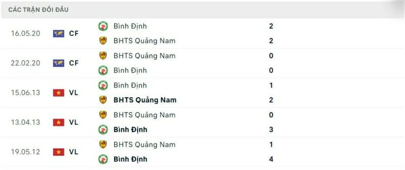 Thành tích đối đầu Bình Định vs Quảng Nam