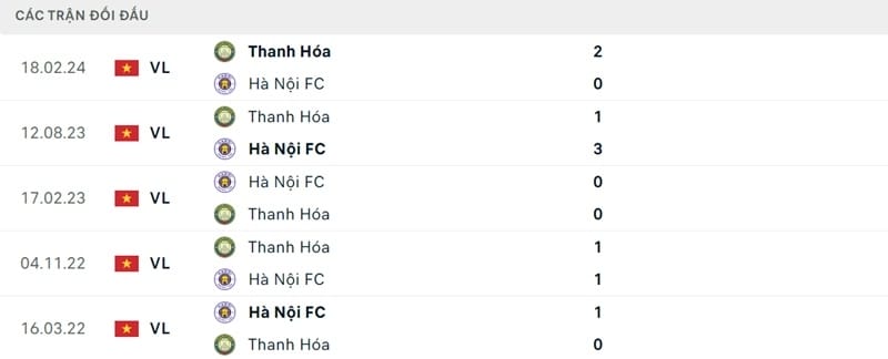 Thành tích đối đầu Hà Nội vs Thanh Hóa