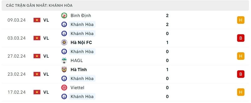 Trong 5 trận gần nhất, Khánh Hòa không lần nào được hưởng niềm vui chiến thắng (3 hòa, 2 thua). Nếu tính cả thất bại trước SLNA vào ngày 26/12/2023, chuỗi trận không thắng của thầy trò HLV Trần Trọng Bình hiện lên đến con số 6.