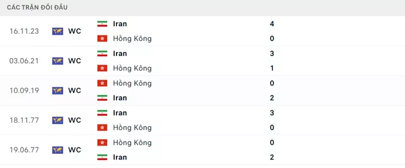 Thành tích đối đầu Hồng Kông vs Iran: