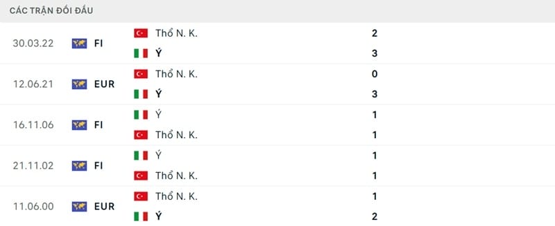 Thành tích đối đầu Italia vs Thổ Nhĩ Kỳ
