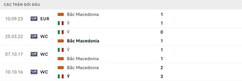 Thành tích đối đầu Italy vs Bắc Macedonia
