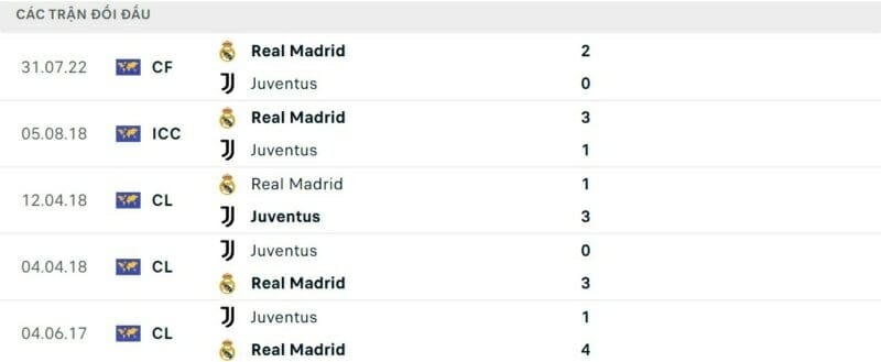 Thành tích đối đầu Juventus vs Real Madrid: