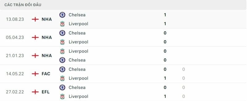 Thành tích đối đầu Liverpool vs Chelsea