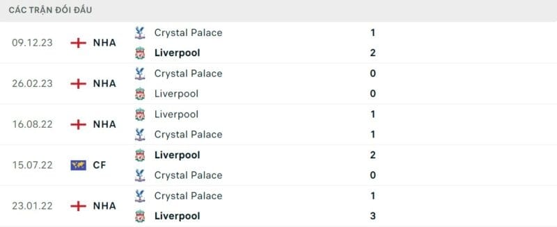 Thành tích đối đầu Liverpool vs Crystal Palace