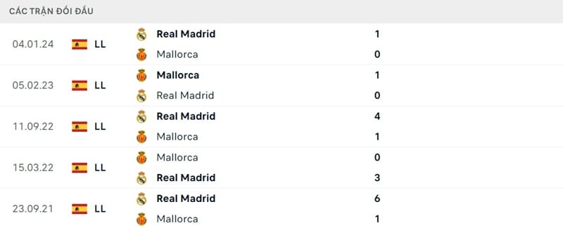 Thành tích đối đầu Mallorca vs Real Madrid
