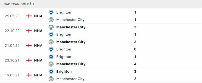 Trong 5 lần gặp nhau gần đây, Brighton thua 3, thắng 1 và hòa 1. Họ cầm chân được đội bóng của Pep ở cuộc thư hùng gần nhất tại Ngoại hạng Anh nhưng là khi được chơi trên sân nhà. Còn ở lượt đi mùa giải trước, Brighton đã thất bại 1-3 tại Etihad. Kịch bản tương tự có thể sẽ lặp lại ở màn tái đấu sắp tới giữa hai đội, khi mà hàng phòng ngự Brighton đang xuất hiện không ít vấn đề.