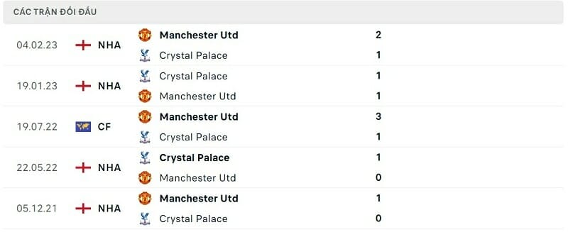 Thành tích đối đầu Man United vs Crystal Palace: