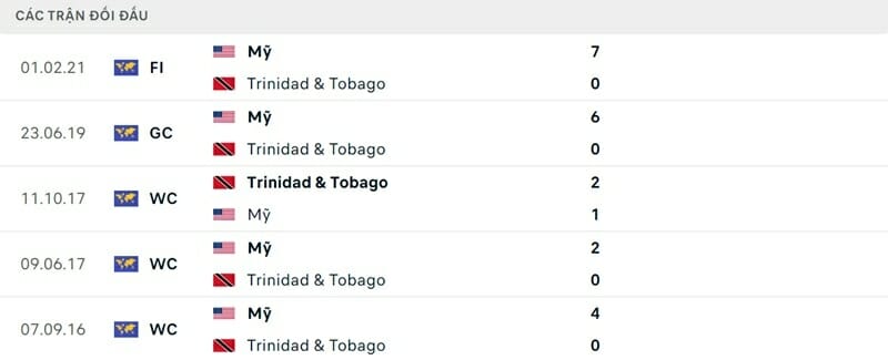 Thành tích đối đầu Mỹ vs Trinidad & Tobago