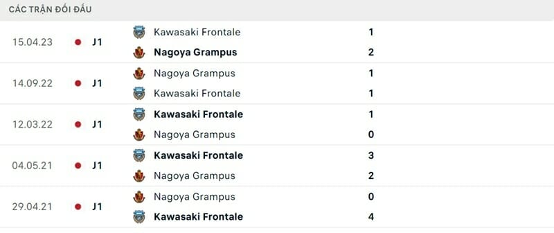 • Thành tích đối đầu Nagoya vs Kawasaki