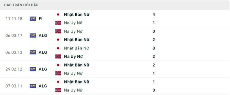 • Thành tích đối đầu Nữ Nhật Bản vs Nữ Na Uy