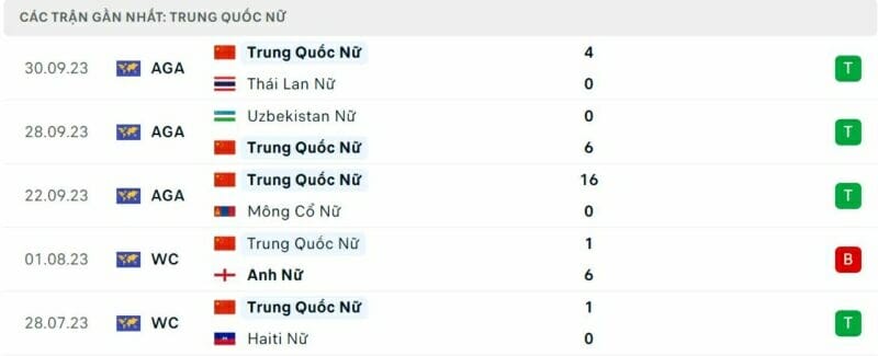 - Nữ Trung Quốc: Wang Linlin (20’), Zhang Linyan (55’), Yang Lina (60’).