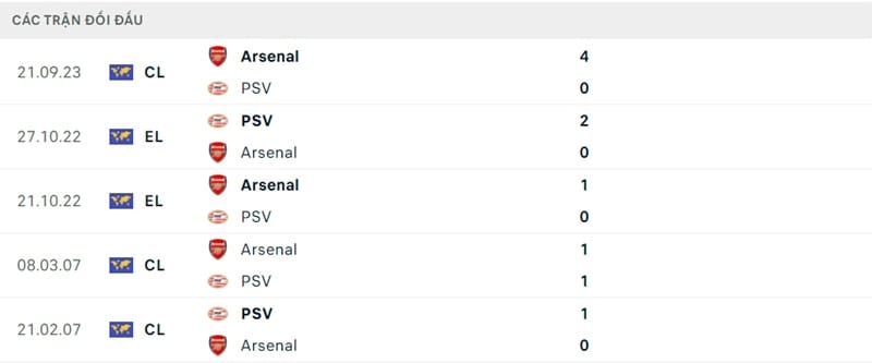 Trong 2 chuyến làm khách gần nhất tại sân Philips, Arsenal đều bại trận và không ghi được bàn nào. Chiến thắng duy nhất của Pháo thủ trên đất Hà Lan trước PSV là thắng lợi 4-0 ở vòng bảng Champions League 2002/03, thời điểm đội bóng thành London còn được HLV Arsene Wenger dẫn dắt.