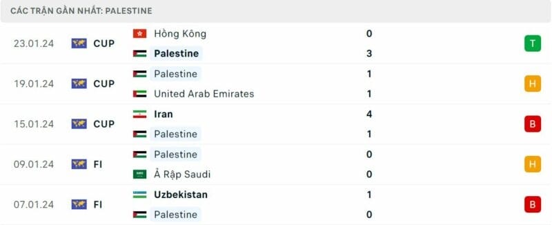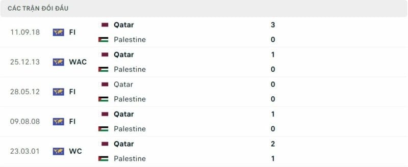 Trong các trận đấu đó, Palestine nhận đến 3 thất bại trắng mà không ghi nổi bàn nào, còn lại là 2 trận đấu kết thúc với tỷ số 1-2 và 1 lần chia điểm không bàn thắng. Từ phong độ, thành tích đối đầu đến lợi thế sân bãi đều đứng về phía Qatar ở cặp đấu loại trực tiếp này.