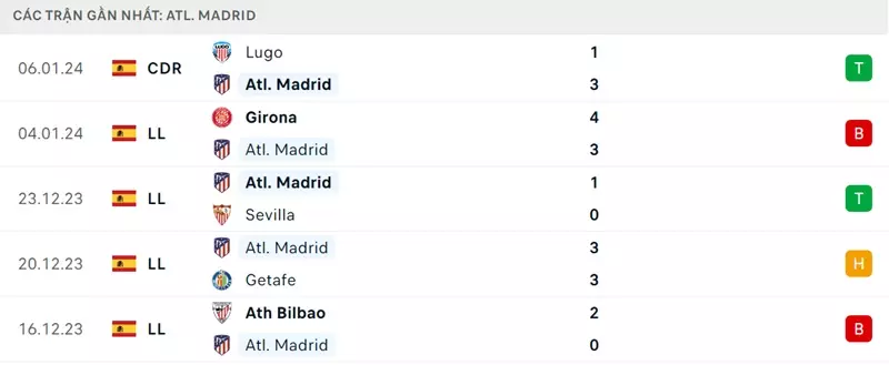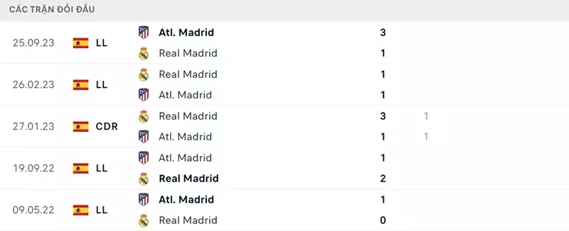 Thành tích đối đầu Real Madrid vs Atletico Madrid:
