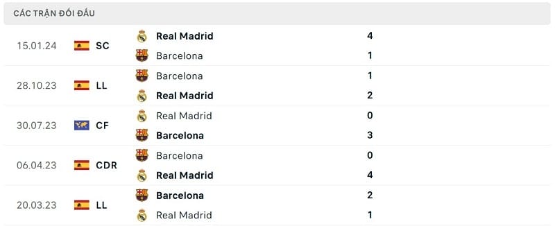 Thành tích đối đầu Real Madrid vs Barcelona