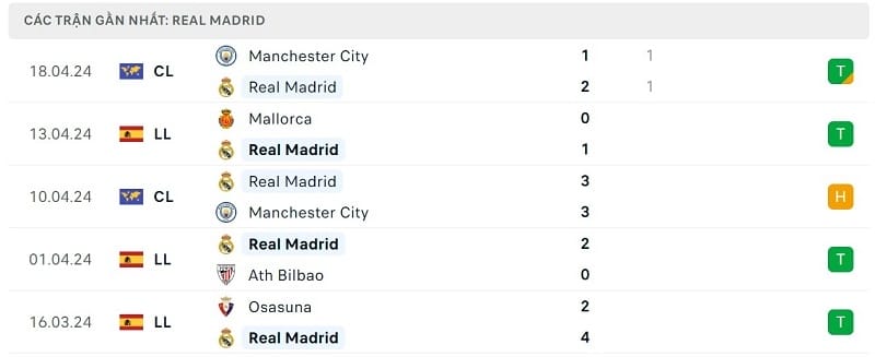 Ở trận đấu gần nhất, Real Madrid đã xuất sắc đánh bại Man City sau loạt luân lưu để tiến vào bán kết Champions League 2023/24. Los Blancos cho thấy họ vẫn là một trong những thế lực hàng đầu của bóng đá thế giới dù phải chịu nhiều tổn thất về mặt lực lượng.