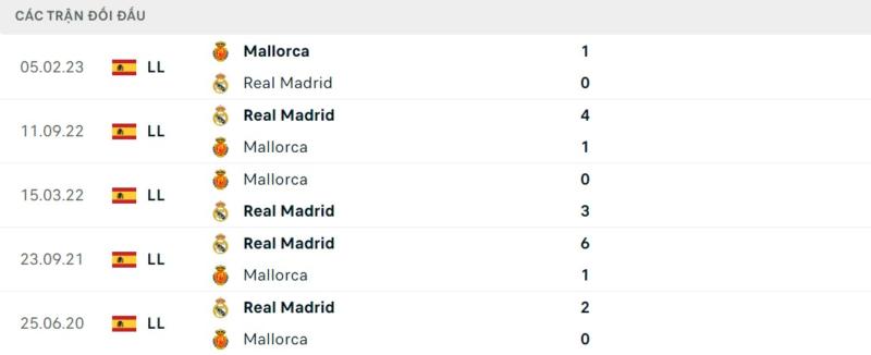 Thành tích đối đầu Real Madrid vs Mallorca